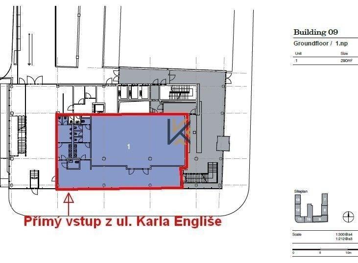 Kancelářská / Obchodní jednotka 290m2 s přístupem z budovy i vlastním vstupem z ulice.