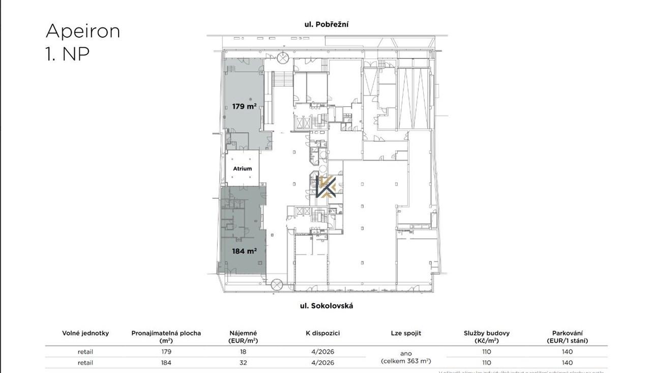Pronájem obchodní jednotky 184 m2 se vstupem ze Sokolovské ulice a pasáže budovy Apeiron. Volné od 1.4.2026.