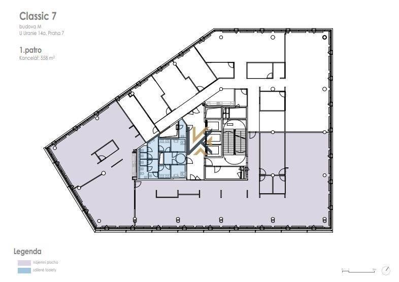 Nabízíme k podnájmu kancelářské prostory v 1. patře o velikosti 558 m2. Podnájem možný pouze do 30.11.2027. Dispozičně: vstupní recepce, 4 zasedací místnosti, 2x open space / kancelář, velká otevřená vybavená kuchyň (lednice, myčka, mikrovlnka), serverovna, sdílené toalety na patře.