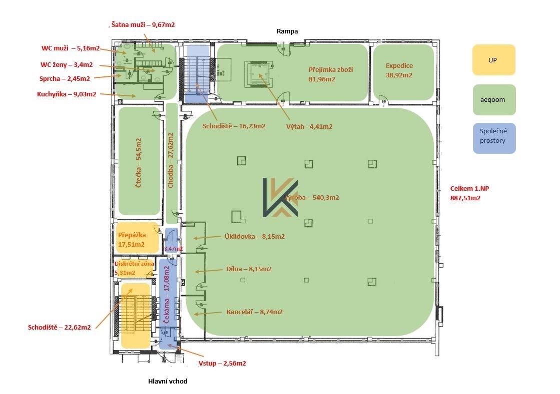 Obchodní prostory v přízemí budovy o velikosti 818 m2, po tiskárně. Dále lze pronajmout sklady 390m2 v suterénu budovy přístupné z prostor výtahem. Stropy cca 2.5m k VZT, optický internet, dva vchody, hlavní a zadní pro zásobování, vyztužené podlahy. Kolaudováno jako výrobní prostor. Kontribuce na dohodě dle délky smlouvy, smlouva max. 3 roky, pak jde budova do rekonstrukce. Lze plátci i neplátci DPH. K jednotce lze pronajmout 5 parkovacích míst v garáži.PRONÁJEM POUZE NA 3 ROKY, TJ. DO ROKU 2028, PAK BUDE REKONSTRUKCE BUDOVY. PRONÁJEM BEZ VĚTŠÍCH STAVEBNÍCH ÚPRAV.