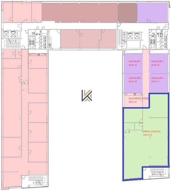 Moderní kancelářské prostory (v plánku modře) jedná se o podnájem, podmínky k individuální diskuzi.
