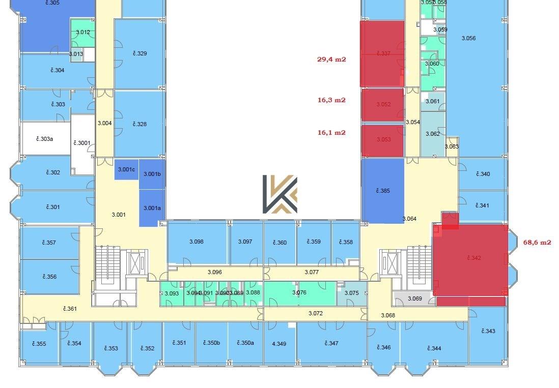 Kancelářské prostory o výměře 2 700 m2 se nacházejí ve 4 patrech budovy (2.NP - 5.NP). Každé patro je o výměře 600 - 700 m2. Prostory možné dispozičně upravit dle přání klienta.