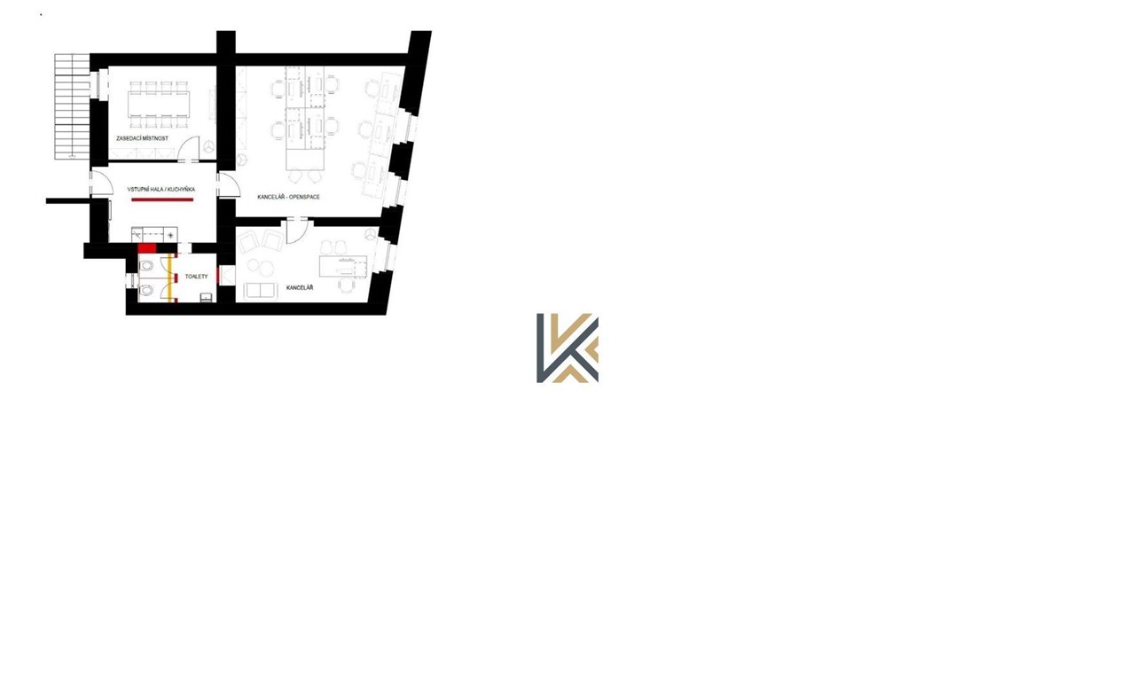 Kanceláře se nachází v 1. patře s rozlohou 132 m2. Dispozičně 2 kanceláře + zasedací místnost + chodba, toalety, kuchyňka.