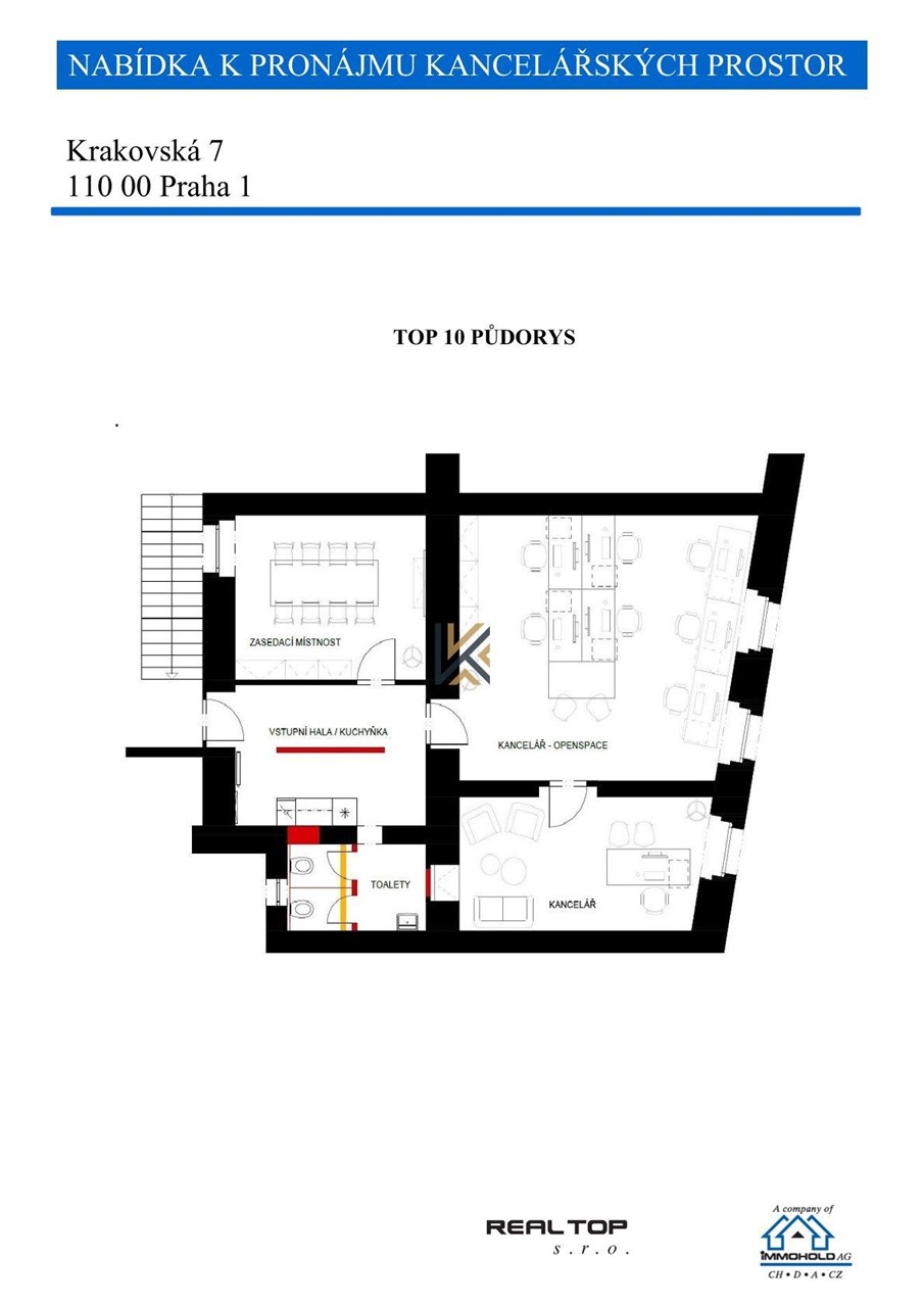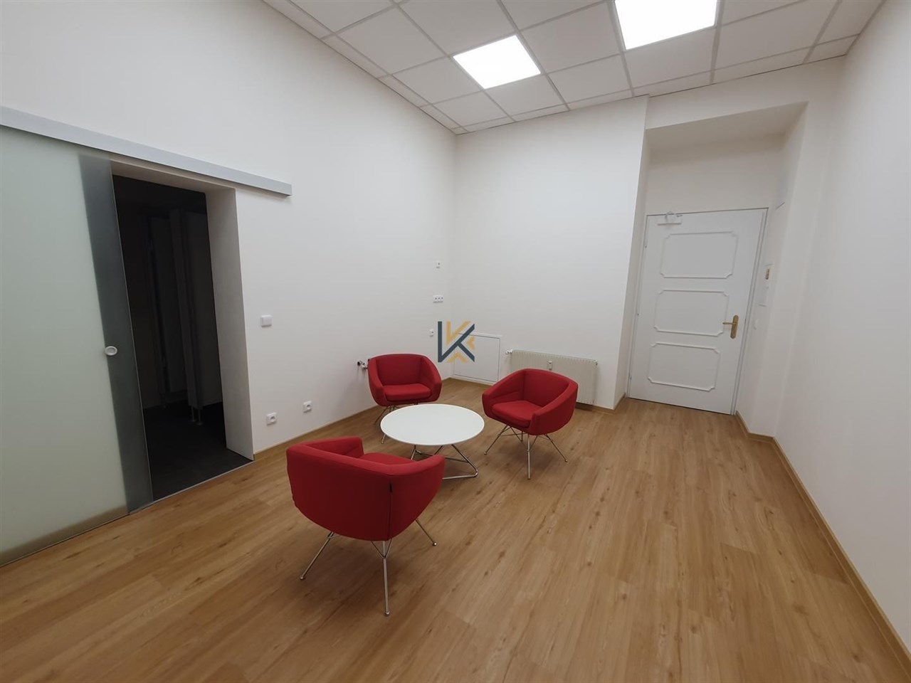 Kanceláře se nachází v 1. patře s rozlohou 115 m2. Dispozičně 2 kanceláře + zasedací místnost + chodba, toalety, kuchyňka.