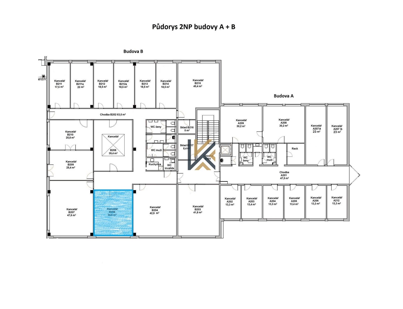 Kancelář (dvoj) o výměře 42 m2 je umístěna v 1. patře.