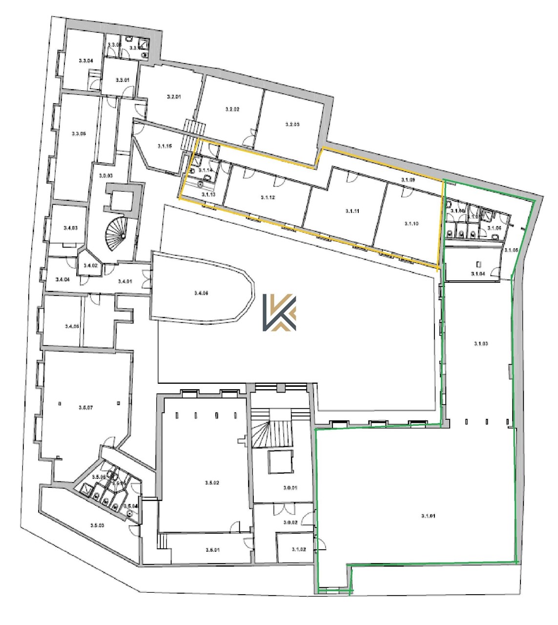 Pronájem prostor o velikosti 293 m2 na plánku provoz 3.1.1 – 3.1.8. a kus z chodby 3.1.9
