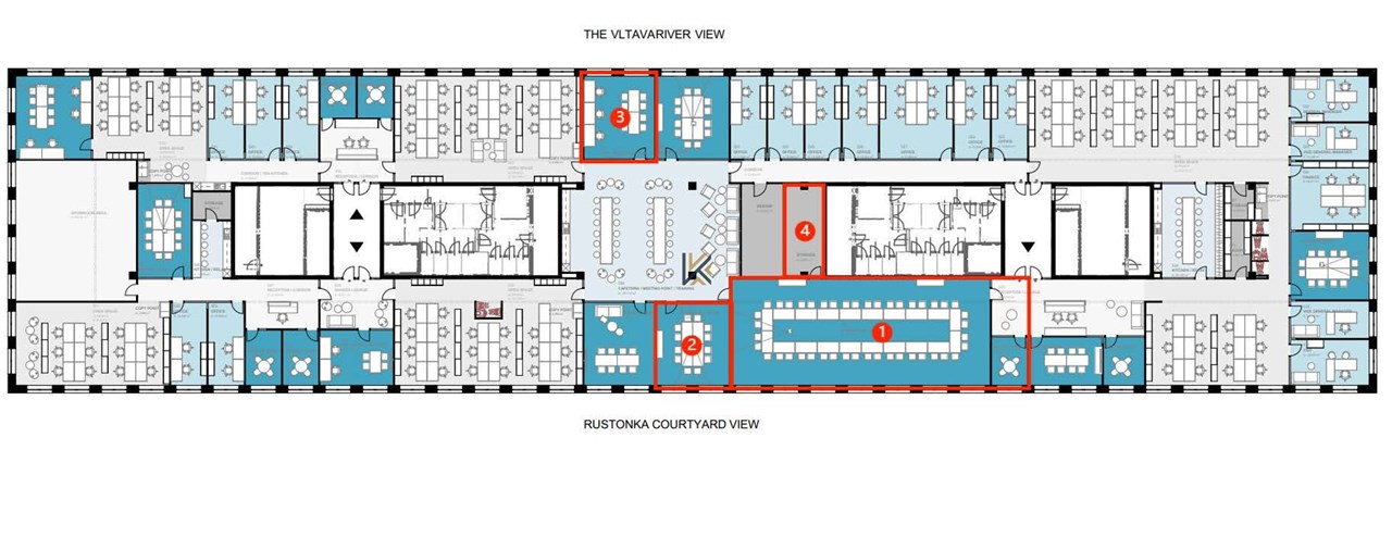 Kancelářské prostory o výměře 230 m2 (na plánku 1 + 4) jedná se o atraktivní dlouhodobý podnájem. Lze rozšířit o další dvě kanceláře v rámci patra o velikosti 44 m2. Celkem tedy cca. 300 m2.