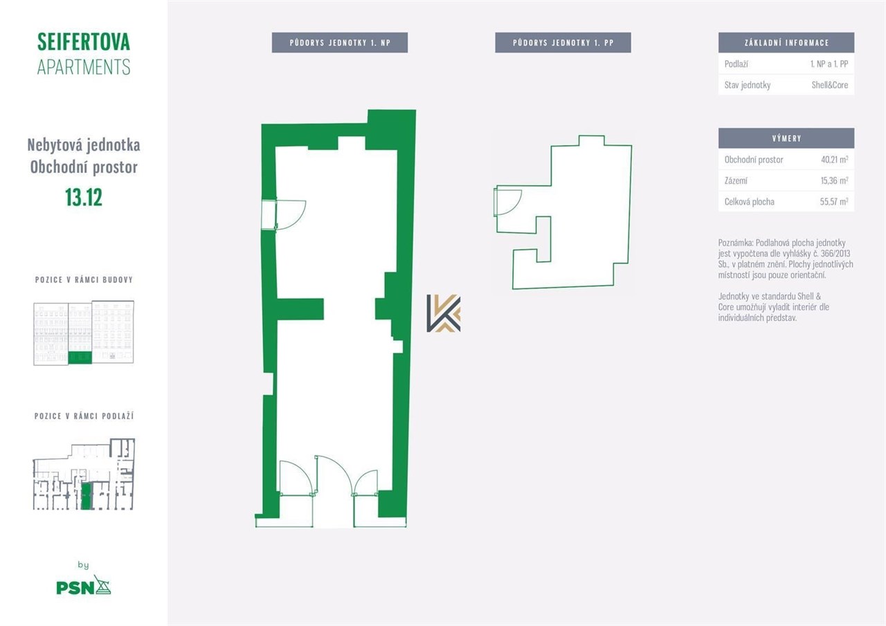 Obchodní prostory 55 m2, z toho 15 m2 zázemí v 1PP. Ve stavu shell and core, dokončení na náklady nájemce.Určeno pro bistro bez většího vaření. Tedy spíš nějaké sushi, cukrárna, atd. Sousední jednotky jsou dvě asijská bistra, polévkárna a kavárna s řemeslnou pekárnou.