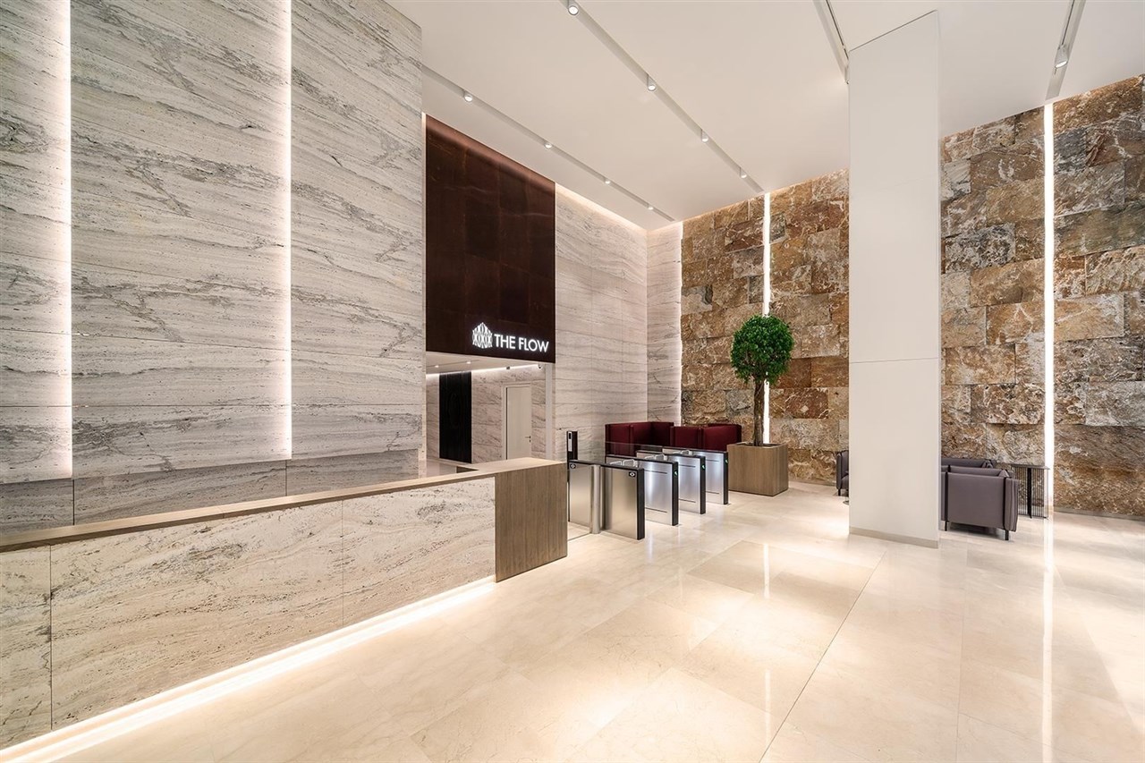 Budova The Flow Building představuje kombinaci jedinečného designu 21. století a nejnovějších technických řešení. Předností projektu jsou rozměrné flexibilní prostory a velké množství přirozeného denního světla. Budova byla navržena tak, aby nabídla pasivní metody ke snížení spotřeby energie nájemců. Jedinečná fasáda vystupující ve vyšších patrech přes linii chodníku a využívající trojrozměrný modulární systém, aby bylo docíleno kontinuálního zakřivení jejího povrchu. Vstupní recepce s výškou 8 metrů k níž přiléhá výtahové lobby působí díky kombinaci velkoformátového přírodního kamene, teplých tónů dřeva a výrazných prvků zeleně, minimalistickým, přesto však luxusním dojmem.