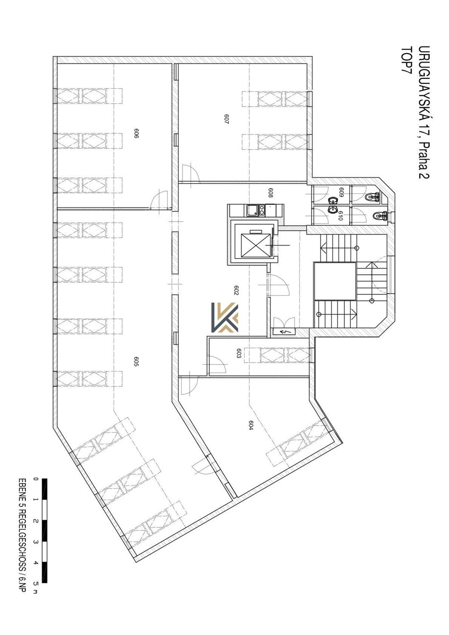 Kancelářské prostory o výměře 237 m2 v 5. patře jsou po kompletní rekonstrukci s novým kuchyňským koutem, WC a podlahami.