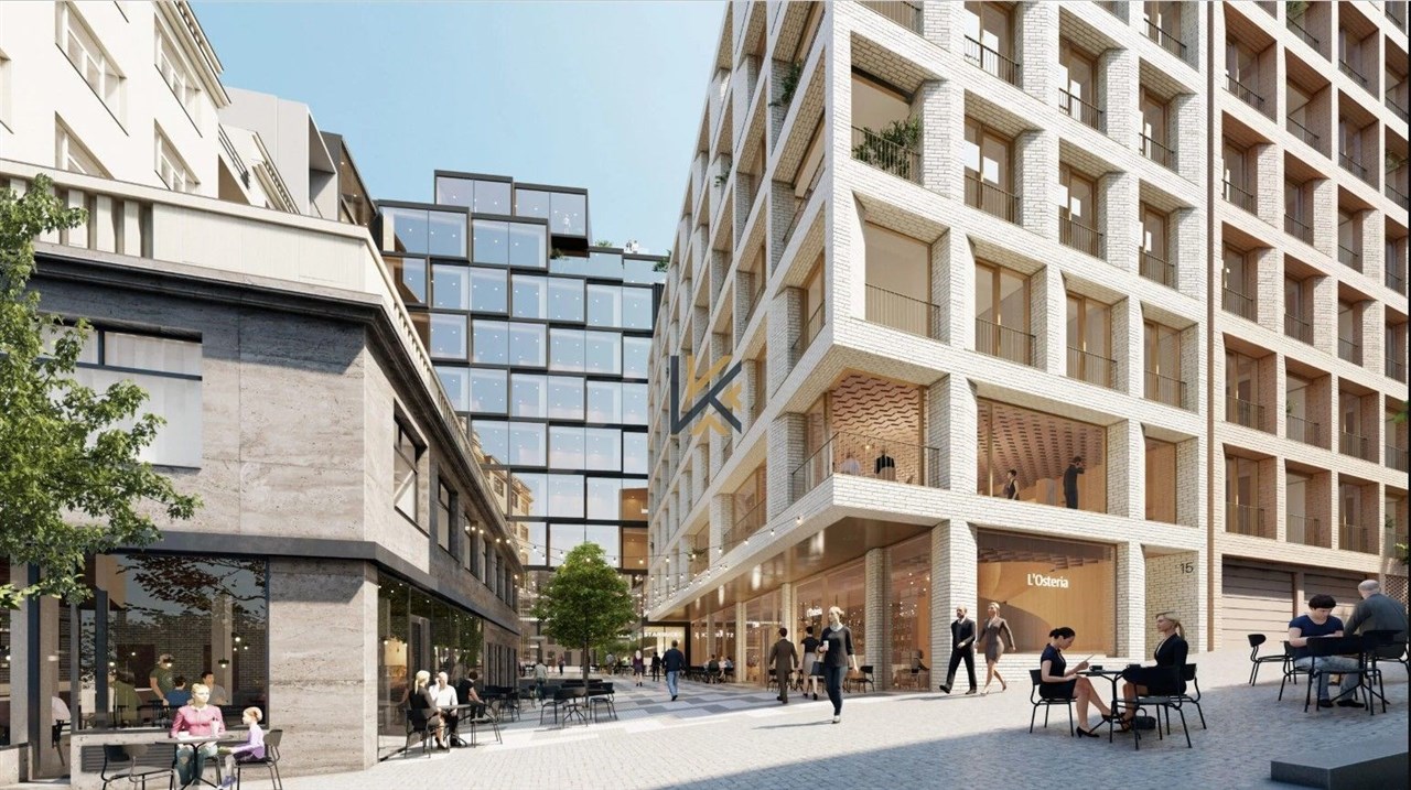 Pronájem moderních kanceláří 392 m2. Společně prostory 65,70 m2. Terasa 90 m2. Cena nájmu 35 EUR/m2, služby 130 Kč/m2, terasa 4 EUR/m2. K dispozici od 4Q/2027.