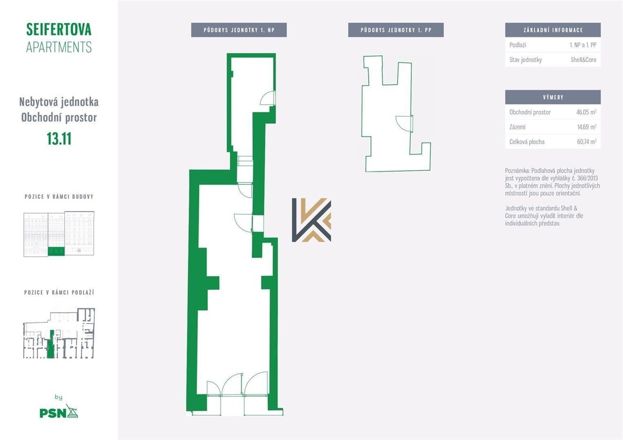 Obchodní prostory 46 m2 + 15 m2 zázemí ve stavu shell & core